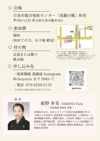 このたび琉球舞踊 重踊流では、4月12日(日曜日)に、埼玉県日高市「高麗の郷」に於きまして、琉球舞踊ワークショップを開催いたします。